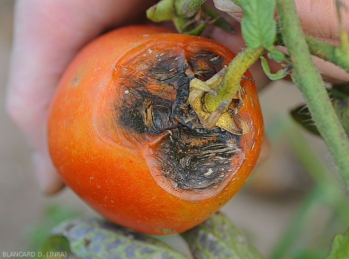 A princípio aparecem nos frutos lesões de tamanho limitado e de contorno mal definido, côncavas e úmidas. Frequentemente localizam-se perto do pedúnculo ou na zona peduncular dos frutos denominada "ombro" ( ombro ) pelos anglo-saxões (figuras 1 a 3). Posteriormente, eles gradualmente se estendem e os tecidos subcuticulares localizados em seu centro logo se tornam marrons e depois pretos. Deve-se notar que a Alternaria alternata pode colonizar secundariamente a ponta dos frutos (figura 4), como outras espécies de Alternaria , e em particular as lesões causadas pela doença fisiológica chamada necrose apical do tomateiro.