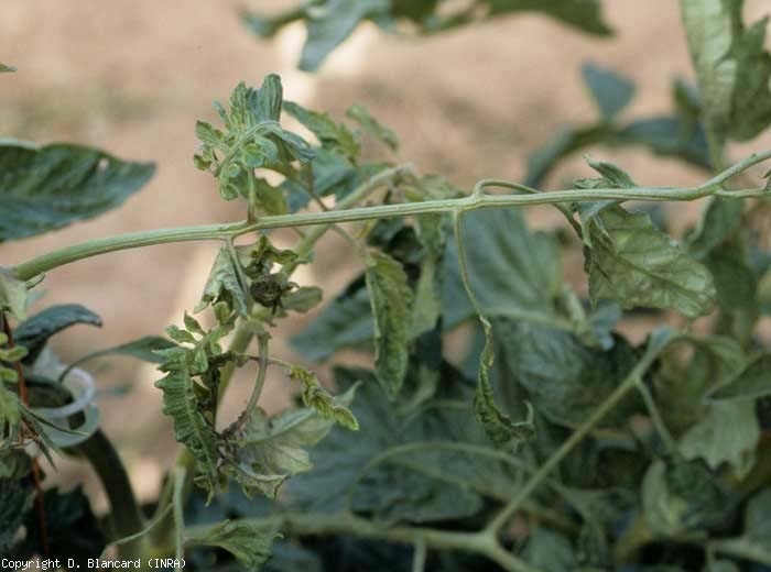 Légère marbrure et une mosaïque plus ou moins marquée sur les folioles. Celles-ci sont parfois filiformes en périodes de faible luminosité (figures 1 et 2). Virus souvent incriminé à la place du ToMV qui est mieux adapté à la tomate. |