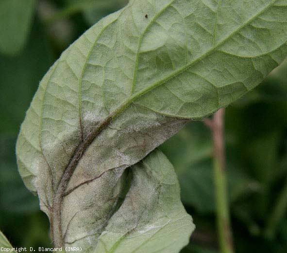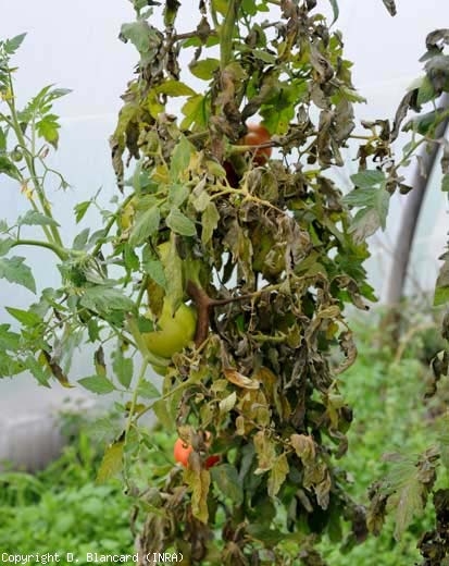 O míldio pode atacar todas as partes aéreas dos tomates . Caracteriza-se pelo desenvolvimento de manchas inicialmente úmidas , ou mesmo praias, nos folíolos (figuras 1 e 2). Esses ataques dão localmente aos tecidos afetados uma coloração verde-clara a marrom-esverdeada . Porções significativas da lâmina acabam sendo afetadas e logo tornam-se castanhas e necróticas (figuras 3 e 4). Essas manchas são freqüentemente circundadas por uma margem de tecido lívido e mal definido, sobre a qual às vezes se forma, na parte inferior da lâmina, uma discreta e fugaz penugem branca composta por esporocistóforos e esporocistos de P. infestans (figuras 5 e 6). . Quando as condições são particularmente favoráveis, a progressão dos sintomas nas bulas é rápida. Folhas, galhos e até plantas acabam necrosando e secando completamente (figura 7).