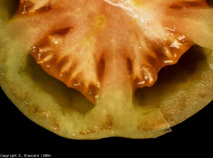 Às vezes as sépalas e pétalas são onduladas e o número de sacos polínicos é diminuído. Frutos infectados podem ser normais ou apresentar vários sintomas: manchas mais ou menos necróticas (figuras 6 e 7), escurecimento interno (figura 8).