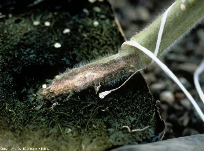 Um cancro freqüentemente se desenvolve no colarinho . Primeiro torna-se marrom escuro e os tecidos doentes ficam mais ou menos deprimidos (figura 4). Este cancro evolui muitas vezes longitudinalmente, de um lado do caule, assumindo a forma de uma chama que se pode estender até mais de 30 cm acima do colo (figuras 5 e 6). A parte central do cancro assume uma coloração rósea a salmão e um aspecto bastante mucoso, devido à formação de esporodóquios do fungo (figura 7).