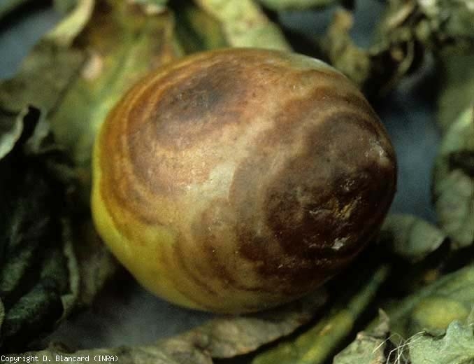 Oomicetos também atacam frutas . . Phytophthora spp são, portanto, responsáveis por lesões irregulares, úmidas, verde-acinzentadas a marrons, que aparecem na porção do fruto em contato com o solo (figuras 8 e 9) em . Evoluem com bastante rapidez e geram padrões em anéis concêntricos, completos ou incompletos, de marrom claro a marrom escuro. Essas lesões são bastante firmes, lisas na superfície e não têm uma margem bem marcada. Um tapete micelial algodoado pode cobrir as lesões em condições úmidas ( P. nicotianae, P. capsici, P. drechsleri, etc.). As lesões causadas por P. mexicana apresentariam anéis concêntricos menos sistematicamente.