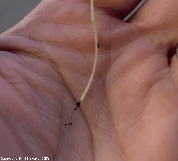 - lesões húmidas e castanhas nas raízes, por vezes atingindo o colo, levando à sua decomposição;