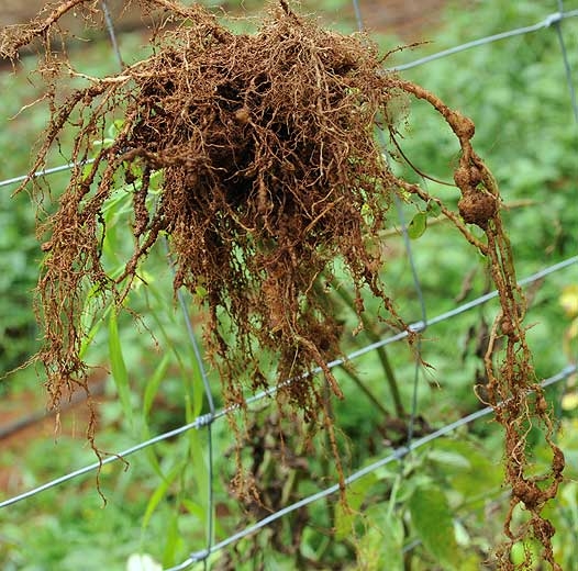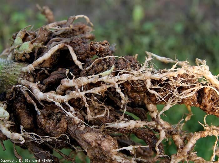 Em muitas situações, os nematóides das galhas não são os únicos bioagressores a atacar o sistema radicular do tomate: eles freqüentemente contribuem para predispor as raízes ao ataque de fungos telúricos, às vezes atuando como um complexo: Thanatephorus cucumeris (Rhizoctonia solani), Colletotrichum coccodes, Pyrenochaeta lycopersici, Sclerotium rolfsii … Assim, a degradação das raízes é mais rápida e os danos são mais substanciais. O Meloidogyne spp. também interagem com alguns patógenos vasculares do tomate, como Ralstonia solanacearum, Fusarium oxysporum f. sp. lycopersici e Verticillium dahliae , aumentando sua incidência e severidade. Cabe agora integrar estes bioagressores telúricos, a bactéria Rhizobium radiobacter , que afectam em conjunto o sistema radicular do tomateiro, amplificando os sintomas de galhas e deformações radiculares (figuras 4, 7 e 10).
