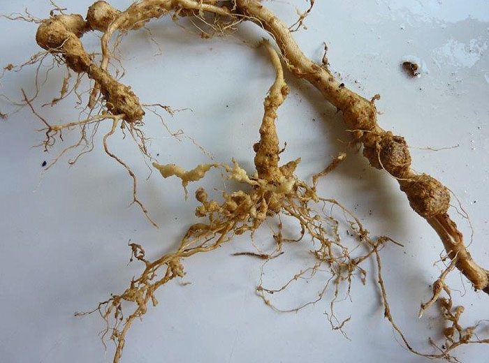 Galhas brancas (figuras 1 e 5), gradativamente amarronzadas, mais ou menos grandes e regulares caracterizam a presença de Meloidogyne spp. ; nematóides nas raízes. A natureza e a extensão das galhas dependem da espécie e do nível de inóculo no solo. As produzidas por Meloidogyne hapla são bastante pequenas porque este nematóide invade os meristemas apicais e, portanto, afeta uma proporção menor das raízes, as induzidas por M. arenaria são do tamanho de uma pérola e afetam quase todas as raízes. As outras duas espécies principais, M. incognita e M. javanica , causam grandes galhas (Figuras 3 e 6) às vezes cobrindo todo o sistema radicular. Observam-se também dilatações longitudinais mais ou menos tortuosas e extensas (figuras 2, 5 e 7).
