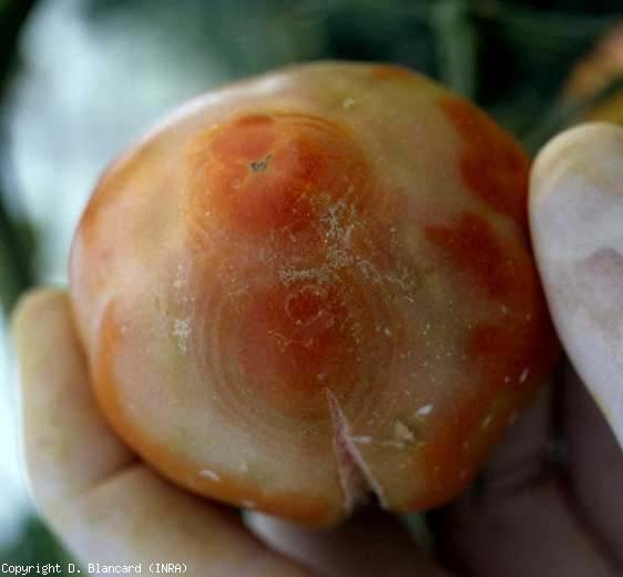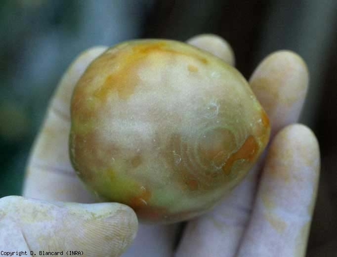 Quando a infecção ocorre antes do aparecimento do primeiro cacho, nenhum fruto se desenvolve. Se os frutos já estiverem presentes, eles sofrem deformações e têm seu crescimento reduzido . Grandes arabescos e por vezes anéis concêntricos (figuras 8 e 9), áreas descoloridas por vezes bronzeadas, manchas necróticas secas e gretadas (figuras 10 e 11) são também visíveis. Frutos maduros também são disformes e mal coloridos, apresentando escurecimento interno. É bastante óbvio que essas diferentes alterações tornam os frutos não comercializáveis.