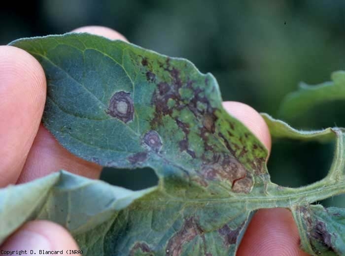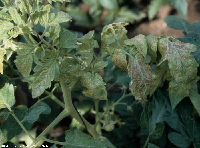 Posteriormente, as áreas afetadas se expandem e os folíolos bastante cloróticos assumem uma tonalidade de bronze , dando origem ao nome “murcha-do-tomate” (Figura 7). O mesmo vale para manchas necróticas que coalescem e levam à necrose e ressecamento de folíolos inteiros. necróticas Lesões (estrias) podem aparecer nos pecíolos e hastes . Após várias semanas, os pés doentes podem estar completamente necróticos. Às vezes, a murcha é observada.