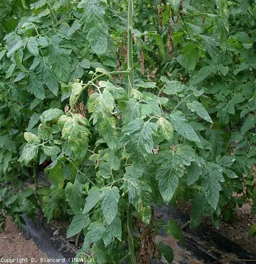 Manchas cloróticas minúsculas, mais ou menos dispersas, aparecem sobre e sob a lâmina foliar dos folíolos do tomateiro (Figuras 1-5). Este amarela gradativamente e assume uma cor opaca (Figuras 3) . Estas manchas também são visíveis no caule (figura 6) e nos pecíolos, mas também em alguns frutos (figura 7).