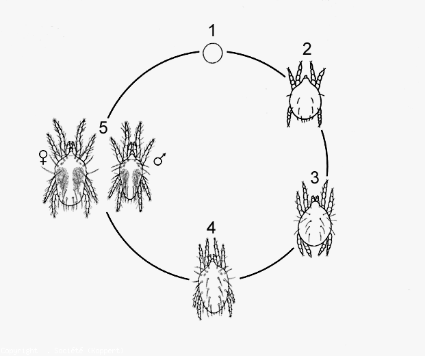 O ácaro passa por 5 estágios de desenvolvimento (Figura 9): ovo, larva, protoninfa, deutoninfa e adulto. A duração de um ciclo varia de acordo com a temperatura: aproximadamente 7 dias a 30°C e 36 dias a 15°C.